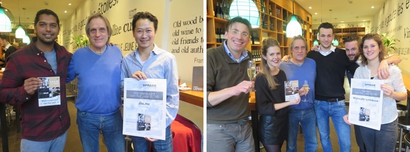 De keuze voor deze drie adressen is gemaakt aan de hand van dat extra, dat bijzondere of onderscheidende dat in deze zaken wordt geboden. Jiu.nu in Eindhoven is verkozen tot ‘WIJNRESTAURANT VAN HET JAAR’, omdat: “Alles in dit restaurant ademt liefde en passie voor wijn.” Chapeau! In Bloemendaal mag zich in 2016 ‘RESTAURANT VAN HET JAAR’ noemen: “In alle rust en met volledige controle wordt er alles aan gedaan om de gasten zich thuis te laten voelen.” De titel ‘WIJNBAR VAN HET JAAR’ gaat dit jaar naar Wijncafé Lefebvre in Utrecht, een voorbeeld voor wijnbars: “Veel lekkere wijnen voor prijzen tussen de € 30 en € 40, van overal ter wereld. Zo hoort het!”Op maandag 30 november ontvingen zij uit handen van hoofdredacteur Ronald de Groot een oorkonde en een deurbordje om de titels te vieren en te kunnen laten zien al alle gasten: