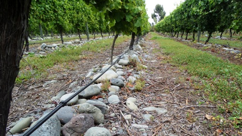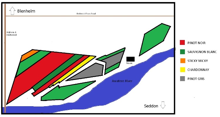 “De wijngaard is aangeplant met een aantal druivenrassen. Om te beginnen twee grote blocks sauvignon blanc aan de kant van de rivier en wat kleinere. Fruit van stokken die het verst van de rivier staan wordt gebruikt voor de ‘Sticky Micky’, een single vineyard Late Harvest. Voor de droge variant wordt een maximale opbrengst van 11 ton/hectare aangehouden, maar voor de ‘Sticky’ is het altijd afwachten. Het is altijd de vraag of hij sowieso wel gemaakt kan worden. Voor de droge Sauvignon Blanc wordt trouwens ook wat fruit aangekocht van de buurman.Verder staat er pinot gris, een ras dat in Nieuw-Zeeland in opkomst is. Afgaande op de 2013 goed voor een heel elegant type wijn. Ook hier geldt een maximumopbrengst van 11 ton/hectare. Voor de pinot noir ligt die lager. Hiervoor is 7 ton/ hectare de limiet. Een nieuwkomer is de chardonnay. In december 2013 is die voor het eerste aangeplant, geënt op stokken sauvignon blanc.”