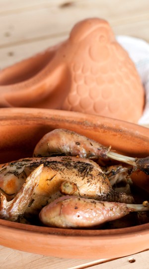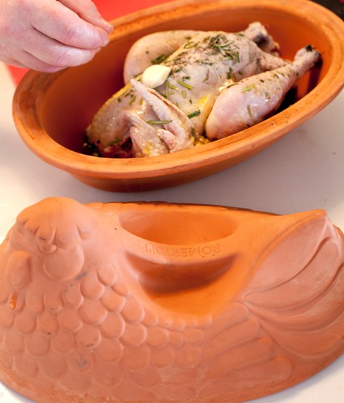 5. Leg de kip in de römertopf (of een andere ovenschaal/ braadpan met deksel) en zet deze in een niet-voorverwarmde oven. Zet de temperatuur op 200 graden.