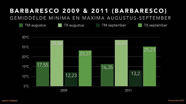 Afbeelding: de gemiddelde minimale (TM) en maximale (TX) temperaturen tijdens de rijpingsmaanden augustus en september in 2009 en 2011. De rijpingsperiode van 2011 was nog wat warmer dan die van 2009.