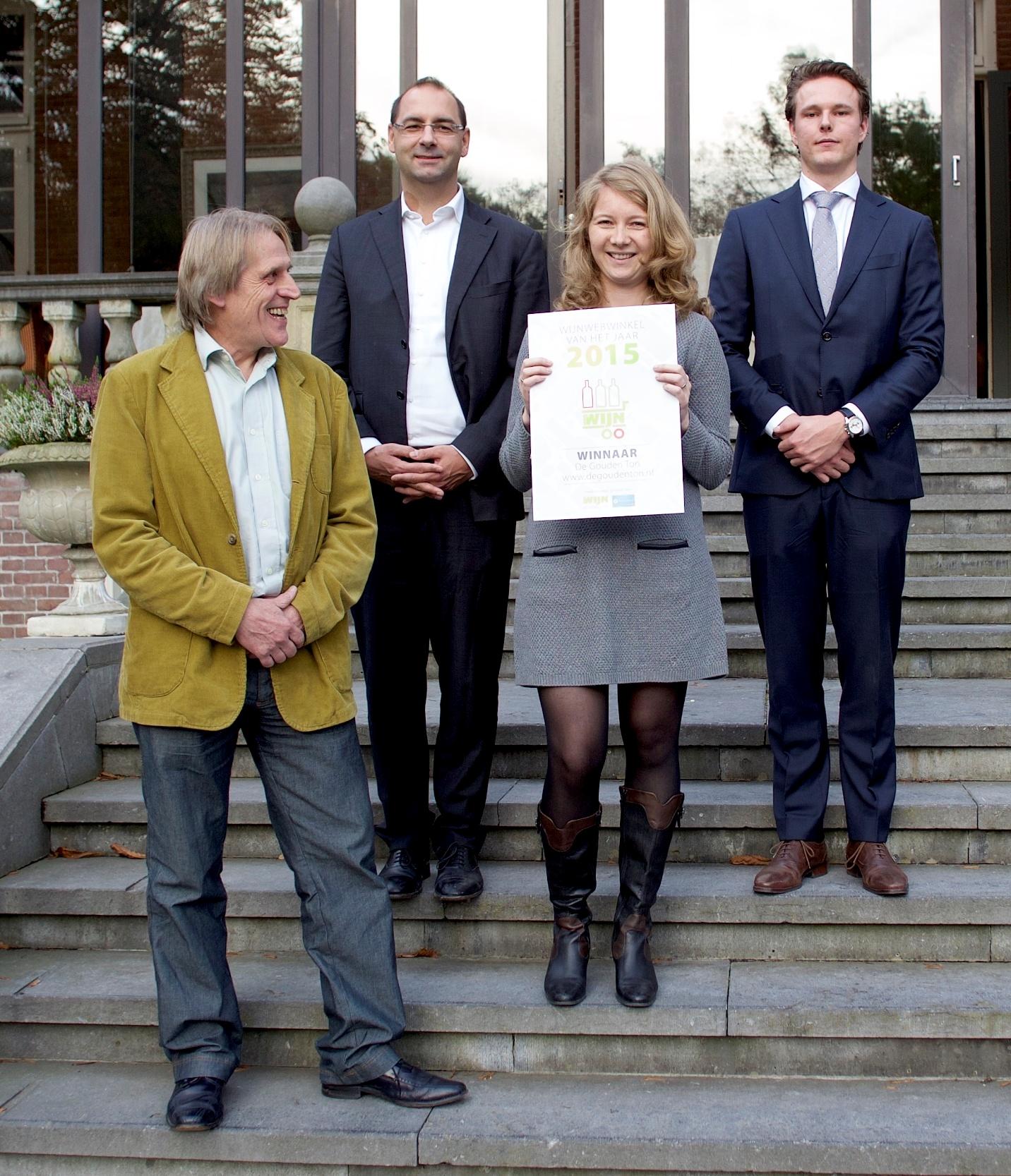 De winnaar bij de wijnwebwinkels is www.degoudenton.nl. “Een site die een zeer goed assortiment weet te combineren met een grote gebruiksvriendelijkheid, heeft de twee belangrijkste pijlers van een goede webwinkel te pakken”. Op de foto de winnende webwinkel met jurylid Ronald de Groot en vertegenwoordigers van de sponsor Flespakket.nl Lars Heugel en Thomas Steetskamp. Degoudenton.nl, ‘Wijnwebwinkel van het Jaar 2015’, ontving net als de winnende wijnwinkel een trofee en oorkonde, en krijgt een reportage in Perswijn. Daarnaast stelt Flespakket.nl voor deze winnaar een budget aan verzendwaarde beschikbaar, ter waarde van € 1500,-.