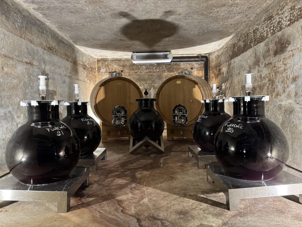 Ook in de wijnmakerij wordt een duidelijk onderscheid gemaakt, met aparte vinificatieruimtes, eigen gistselecties en eigen vaten voor opvoeding. Ook hier zag ik alle speeltjes voor een eigentijdse opvoeding, zoals diverse barriques, tonneaux en foeders, verschillende amforen, eieren van Nomblot en wineglobes. Toch maakten de betonnen cuves van meer dan 100 jaar oud de meeste indruk.