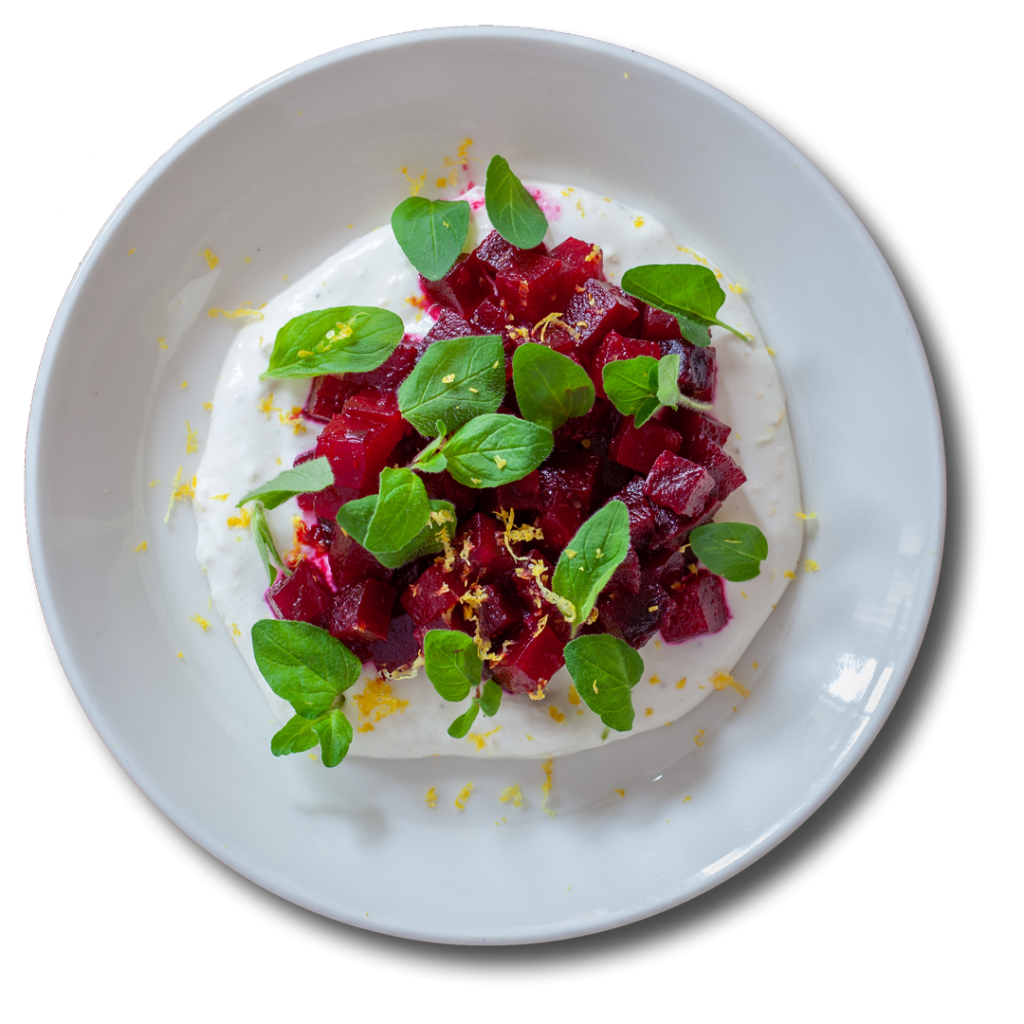 4 Maak een spiegeltje op het bord van het geitenkaas/yoghurt mengsel. Leg hier de rode biet op. Pluk de mooiste blaadjes van het bosje oregano en verdeel over het bord. Rasp de schil van de citroen over het geheel.