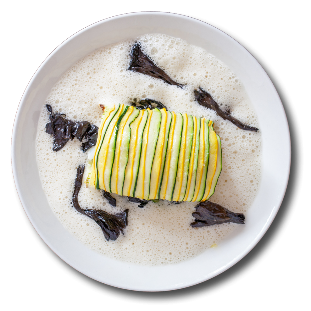 1 Snijd de kabeljauw in porties van 150 tot 180 gram en bestrooi ruim met zout. Rol de stukken vis in de heel dungesneden linten van de courgette. Voor optimaal optisch resultaat, wissel je de kleuren courgette met elkaar af.