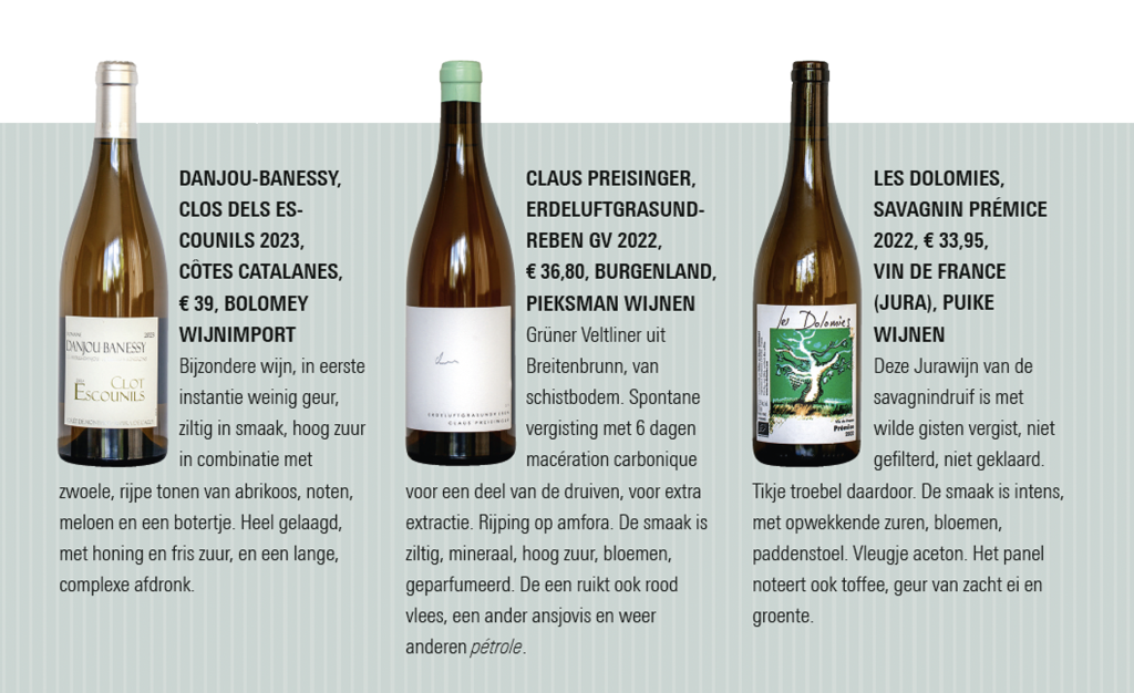 Het panel bestaat voor de helft uit dertigers en voor de helft uit 55-plussers. De veilige Escounils valt het best in de smaak bij de oudere helft. De rijpheid van wijn en gerecht gaan uitstekend samen. Eén proever vindt de tweede wijn, de Grüner Veltliner, veel te uitgesproken, met te veel vluchtige zuren, twee (jonge) proevers vinden het juist de mooiste combi: ‘Heel complex en lekker fris’ en ‘Mooie balans.’ Ook de Savagnin heeft zijn aanhanger: ‘Beste keus, heel makkelijk en lekker, slurpt snel weg.’ Anderen schrijven: ‘Wijn overheerst in zijn zuren.’ Kortom: een spannende proeverij!
